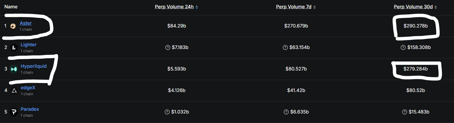 Deberíamos destacar que #AsterDEX ha superado #Hyperliquid en el Volumen Perp de 30 días