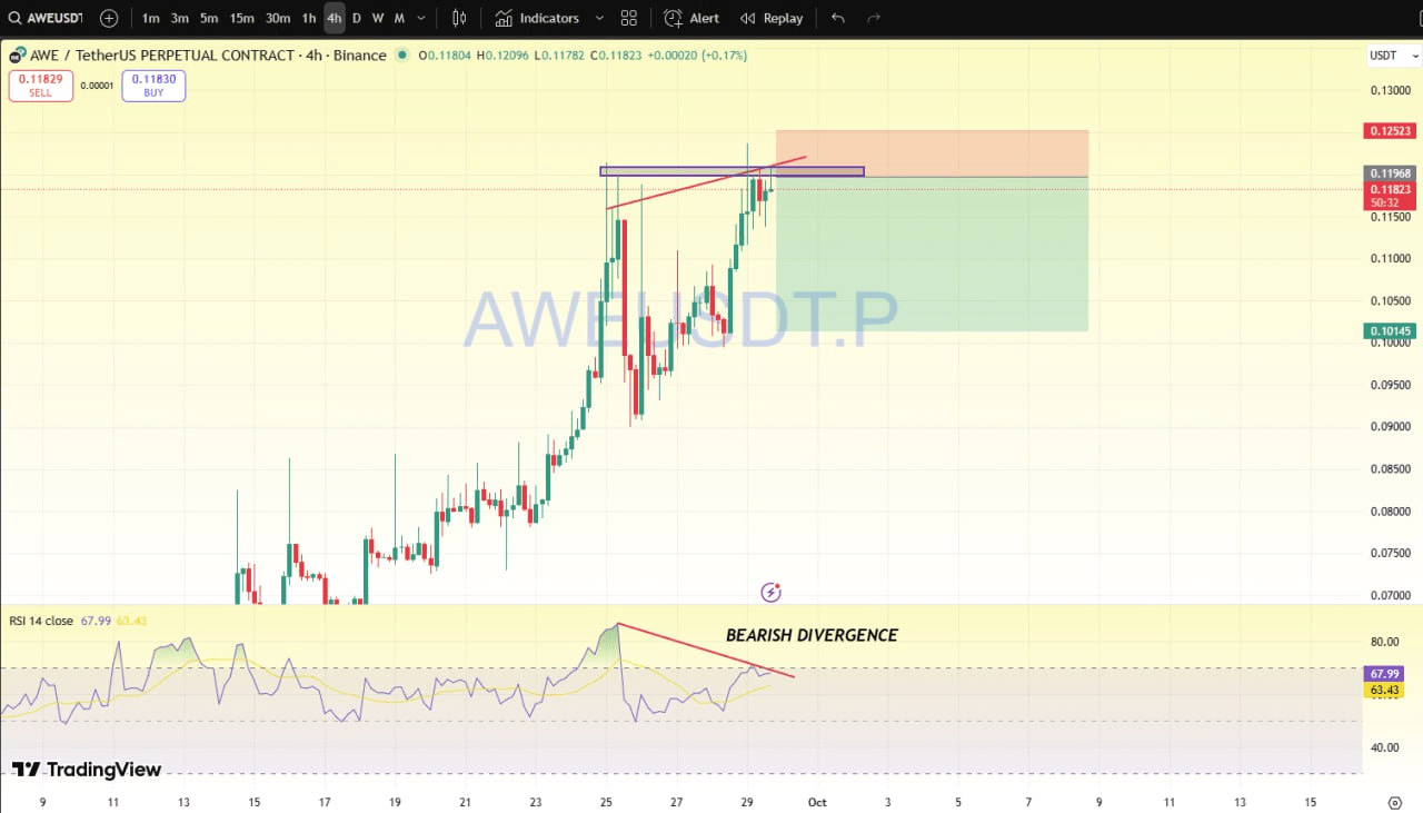 Aquí puedo ver una divergencia bajista en el marco de tiempo de 4H, y el precio actualmente enfrenta resistencia. Puedes abrir una posición corta con bajo apalancamiento, pero asegúrate de gestionar tus propios riesgos.