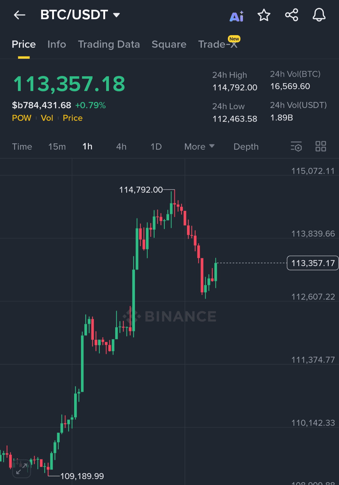 $BTC está mostrando un fuerte impulso en el mercado. Después de tocar un máximo cerca de 114,792, el precio retrocedió ligeramente y ahora se cotiza alrededor de 113,357. El movimiento muestra que los compradores aún están activos y empujando la tendencia hacia adelante. Cada caída está siendo comprada, lo que es una clara señal de fortaleza por parte de los toros.
