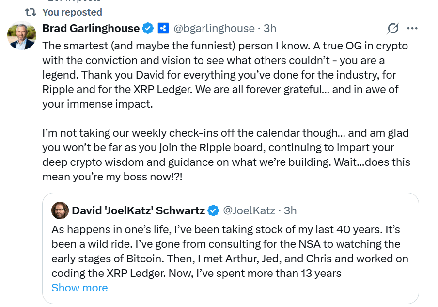 El CEO de Ripple, Brad Garlinghouse, elogió a Schwartz como “un verdadero OG en cripto” con una convicción, visión y humor inigualables, acreditándolo por dar forma tanto a Ripple como al $XRP Ledger más amplio. Garlinghouse agregó que el nuevo papel de Schwartz asegura que sus profundas percepciones sigan siendo centrales para la misión de Ripple.