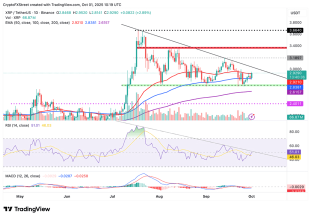 XRP rebota por encima del soporte de la media móvil exponencial de 100 días, aumentando las posibilidades de un rompimiento por encima de 3.00 dólares.