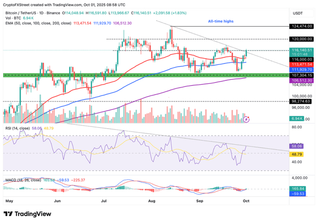 Bitcoin ($BTC ) comenzó octubre de manera fuerte, rompiendo el precio del nivel de 116,000 dólares el miércoles. A pesar de las expectativas generales de que septiembre suele ser un mes bajista para las criptomonedas, BTC logró ganancias del 5.31%.