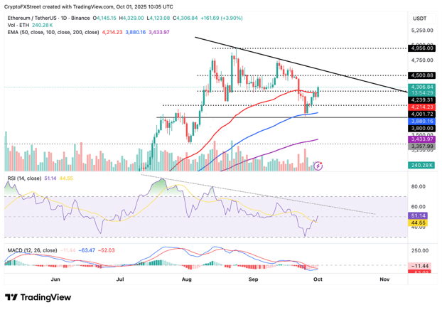 Ethereum se negocia alrededor de 4,300 dólares mientras los toros empujan los precios hacia arriba en el mercado de criptomonedas más amplio. La perspectiva alcista a corto plazo está respaldada por la media móvil exponencial de 50 días en 4,214 dólares, la media móvil exponencial de 100 días en 3,880 dólares y la media móvil exponencial de 200 días en 3,433 dólares. El cruce alcista del RSI por encima de la línea de señal indica que el impulso alcista está aumentando.