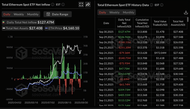 El interés institucional en Ethereum también está ganando impulso, con flujos estables de 547 millones de dólares el lunes y 127 millones de dólares el martes. Aparte del ETHA de BlackRock, los otros nueve fondos ETF de Ethereum en los Estados Unidos no vieron flujos o flujos de salida el martes.