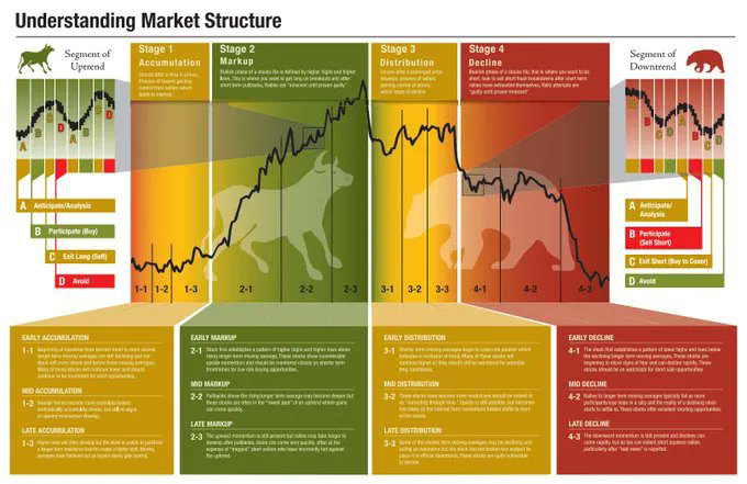 Al igual que los mercados tradicionales, el mercado cripto sigue un ciclo compuesto por cuatro fases clave: AcumulaciĂłn, Markup (Tendencia Alcista), DistribuciĂłn y Markdown (Tendencia Bajista).