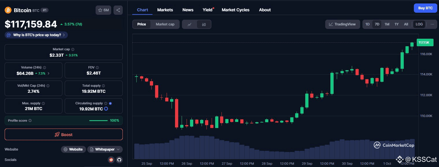 BTC вернулся на $117k, по мере того как вероятность снижения ставки ФРС 29 октября достигла 100% 🧪
