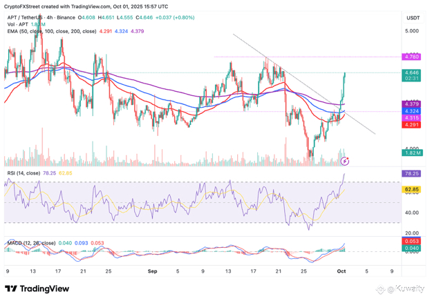 تمتد Aptos ($APT ) في تعافيها، حيث تتداول فوق 4.60 دولارات مع استعادة العملات الرقمية للزخم الصعودي يوم الأربعاء، بعد تقلبات سعرية شديدة في سبتمبر. بناءً على الصورة الفنية قصيرة المدى لـ APT، يمكن أن يشدد الثيران قبضتهم للحفاظ على الاتجاه الصعودي فوق 5.00 دولارات في الأيام القادمة.