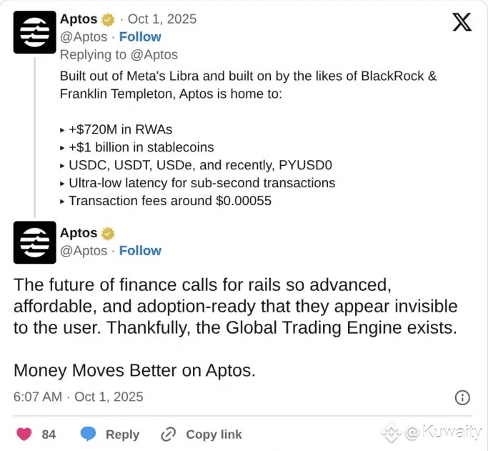سلطت Aptos الضوء على أن شبكتها تحتوي على أكثر من 720 مليون دولار من الأصول الحقيقية (RWAs) و1 مليار دولار من العملات المستقرة، بما في ذلك USDC وUSDT وUSDe.