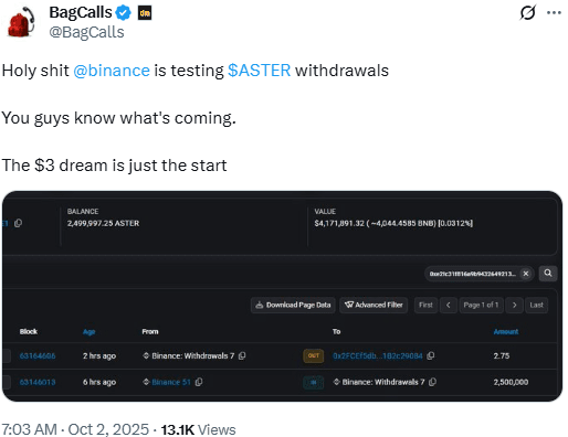 La emoción se disparó cuando el propio CZ alabó públicamente a ASTER, destacando su sólida infraestructura, función de orden oculto y compatibilidad multichain. Sus comentarios hicieron que el precio de ASTER subiera más del 1,500% en una sola semana.