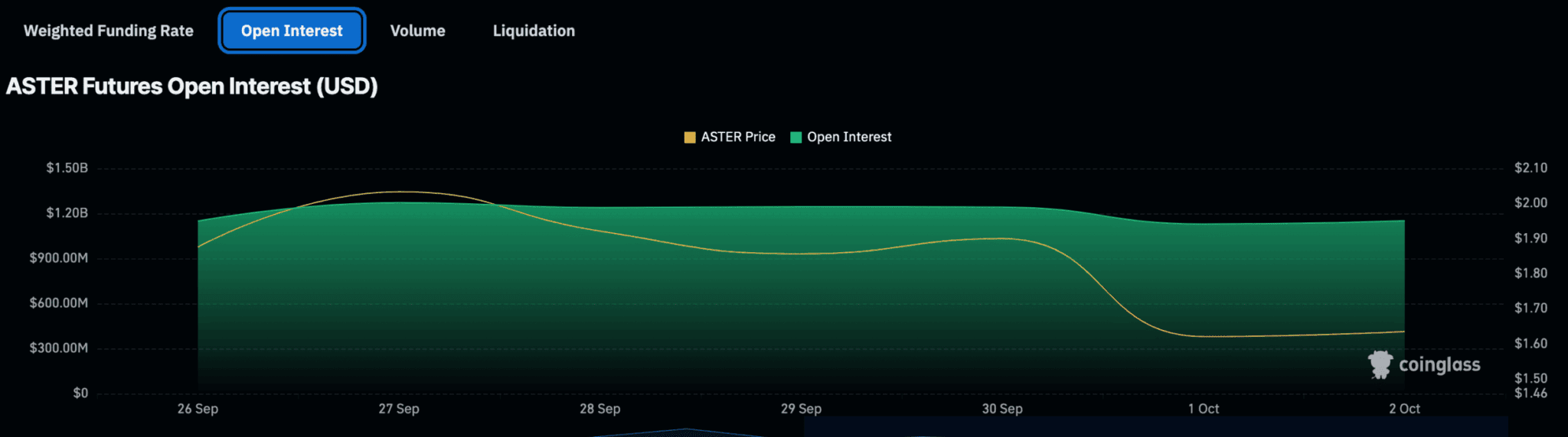 Los datos de CoinGlass muestran que el interés abierto en ASTER ha aumentado un 7.57% a $1.2 mil millones, reflejando una creciente confianza y actividad especulativa.