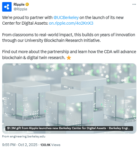La Universidad de California, Berkeley ha inaugurado el Centro para Activos Digitales (CDA) – un nuevo centro de investigación dedicado a tecnologías de blockchain, finanzas digitales y gemelos digitales. El proyecto cuenta con el respaldo de Ripple, que proporcionó $1.3 millones en RLUSD, la stablecoin respaldada por el dólar estadounidense de la compañía.