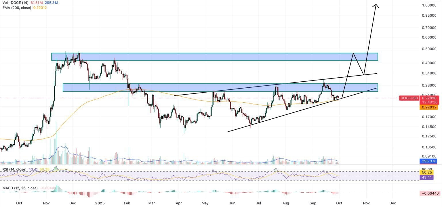Esta zona de soporte se alinea con la media móvil exponencial (EMA) de 200 días, fortaleciendo su relevancia desde una perspectiva técnica. Un rebote desde este nivel podría preparar el escenario para $DOGE para volver a probar el límite superior de su canal de precios ascendente. Un breakout confirmado por encima de este canal indicaría un renovado impulso alcista.