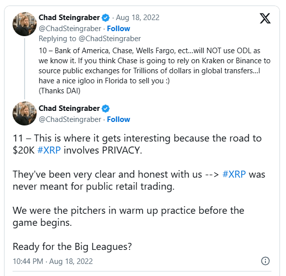 Este renovado enfoque en la privacidad ha revivido un modelo de valoración de XRP que fue compartido por primera vez en 2022 por el desarrollador de juegos y analista de la comunidad Chad Steingraber. En ese momento, presentó lo que creía que podría ser el camino hacia un XRP de $20,000, basando su caso en tres principios.
