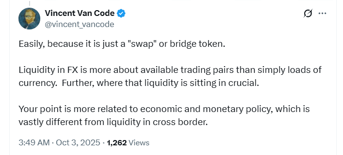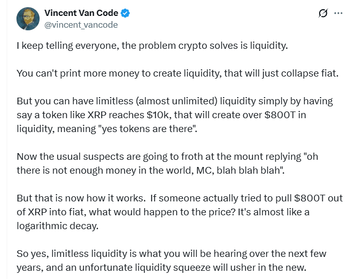El ingeniero de software Vincent Van Code presentó una visión contrastante. Según Van Code, XRP debería ser juzgado como una herramienta que puede mover liquidez, no como un activo que debe ser completamente convertido en efectivo para tener importancia.