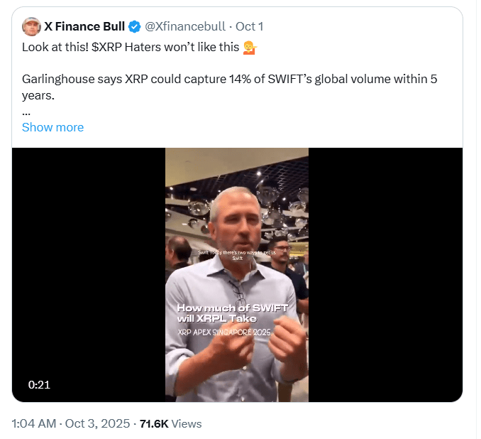 En el evento XRPL Apex en Singapur en 2025, el CEO de Ripple, Brad Garlinghouse, trazó una línea entre los sistemas de mensajería y la liquidez real.