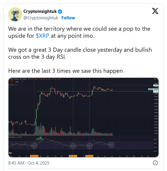 El analista de mercado Cryptoinsightuk ha sonado la alarma para los titulares de XRP, señalando que el gráfico de tres días del activo ahora muestra un cruce alcista del Índice de Fuerza Relativa (RSI) junto a un fuerte cierre de vela de tres días.