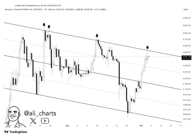 El analista de mercado Ali señaló recientemente que Ethereum sigue probando una línea de tendencia descendente, pero simplemente no puede romperla. Cada vez que ETH se acerca a $4,600, los vendedores aparecen en masa, creando una pared de resistencia. El gráfico cuenta la historia claramente: Ethereum está atrapado dentro de un canal en pendiente hacia abajo, y cada intento de escapar del límite superior ha sido rápidamente desbaratado.