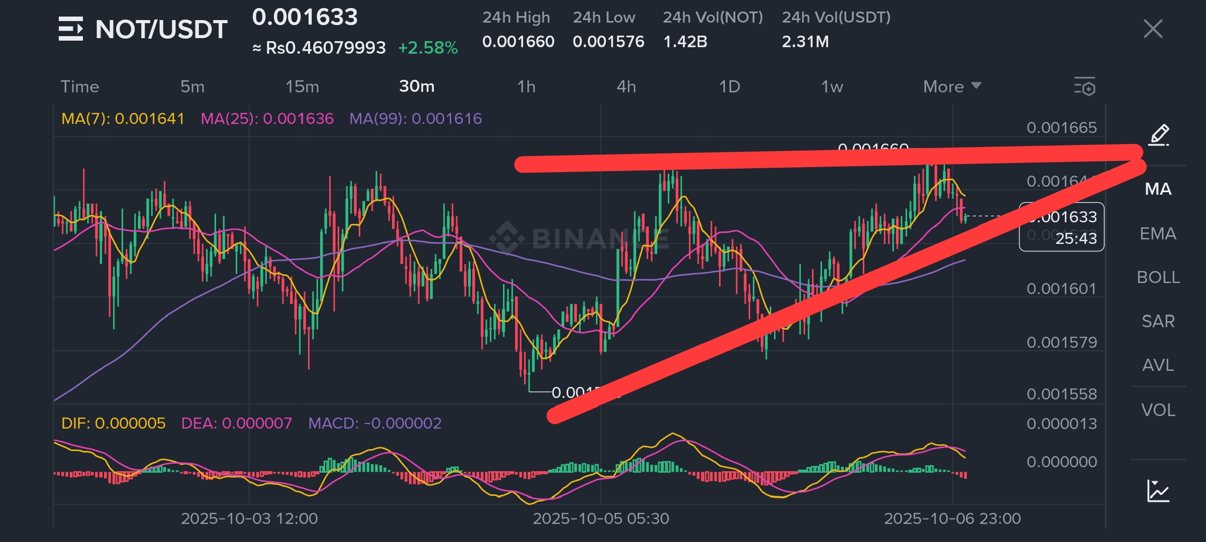 Tenemos un Triángulo Ascendente limpio en el gráfico de 1H — mínimos más altos presionando contra la resistencia en $0.001660, con volumen construyéndose silenciosamente bajo la superficie.