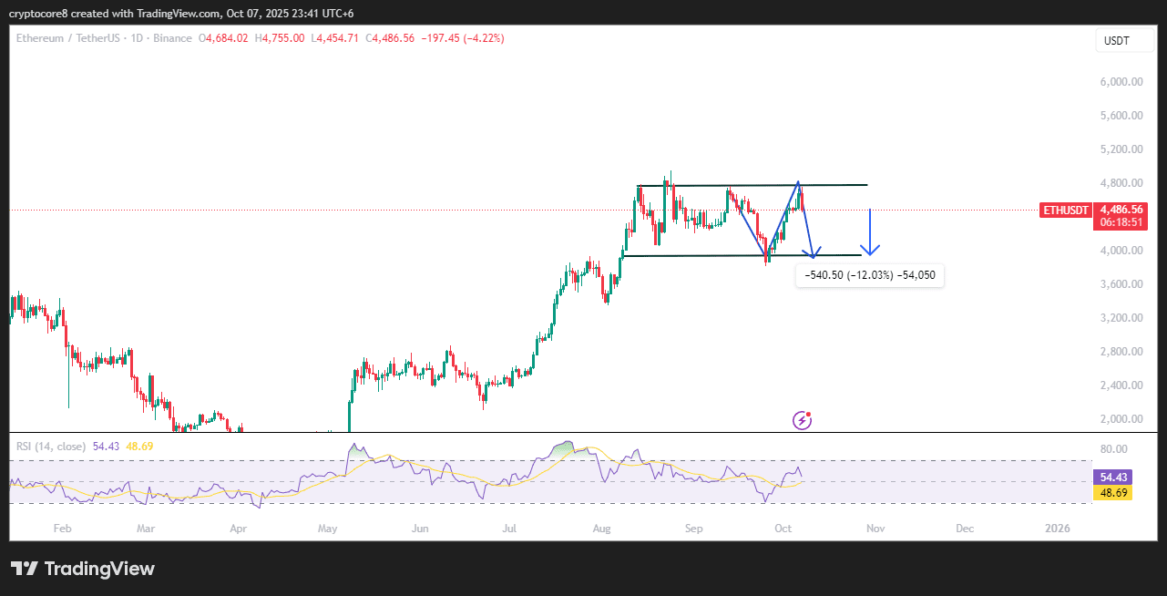 El gráfico de ETHUSDT indica que se está formando un patrón de doble techo, señalando presión bajista. El precio está cayendo desde la resistencia hacia el soporte, con una posible caída del 12%. El RSI se está debilitando, confirmando el impulso de venta. La configuración indica un posible mayor descenso en el mercado.