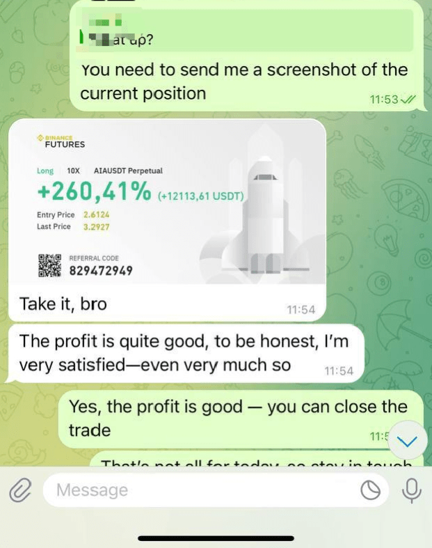 También apreciemos la importancia de la comunicación y la estrategia en el trabajo en equipo. El intercambio entre el trader y el analista en el chat muestra cuán crucial es tener claridad en la toma de decisiones. El mensaje “Necesitas enviarme una captura de pantalla de la posición actual” refleja responsabilidad: siempre conocer el estado de tu posición ayuda a tomar decisiones inteligentes. La respuesta “Tómalo, hermano” seguida de “La ganancia es bastante buena” captura perfectamente la emoción de alcanzar una gran victoria.