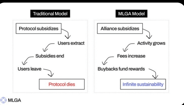 A diferencia del modelo tradicional, donde los protocolos subsidian a los usuarios que extraen valor hasta que terminan los subsidios, los usuarios se marchan y los protocolos finalmente fracasan. El modelo de MLGA establece un ciclo sostenible donde la subsidización de la Alianza impulsa el crecimiento de la actividad, las tarifas aumentadas permiten recompras que financian recompensas, creando sostenibilidad infinita.