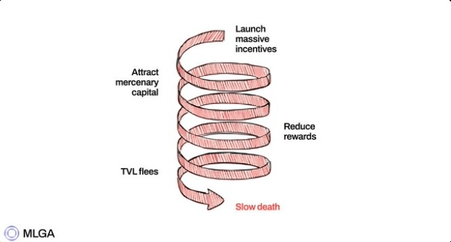 Lanzar incentivos masivos → Atraer capital mercenario → Reducir recompensas → TVL huye → Muerte lenta