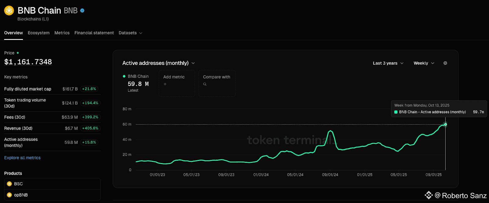 USDT cumple una función clave como stablecoin, pero su precio está anclado a 1 dólar. Cuando el mercado rota hacia el riesgo, el capital busca activos con potencial de apreciación y uso real. BNB ofrece ambas cosas.Efecto red en BNB Chain