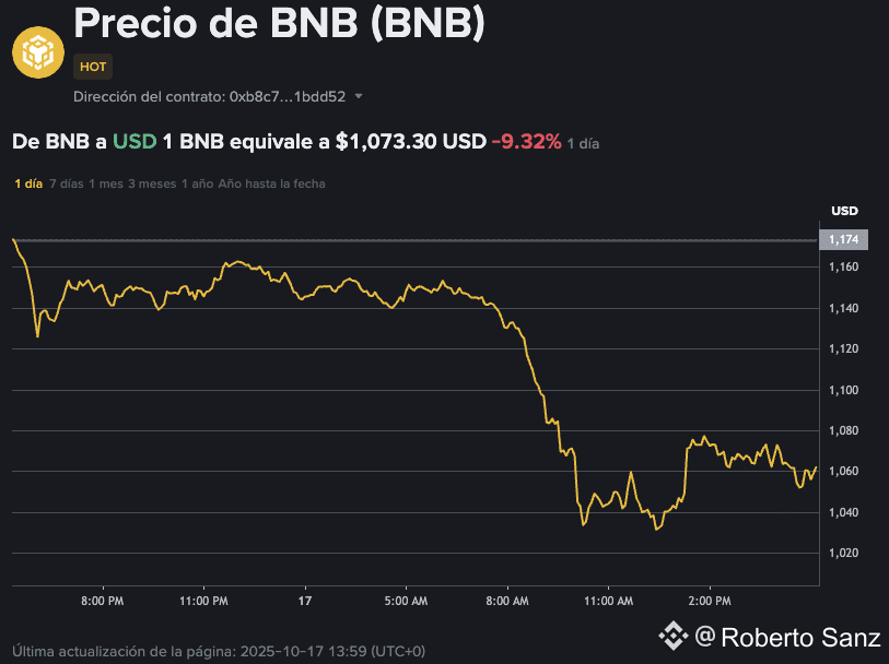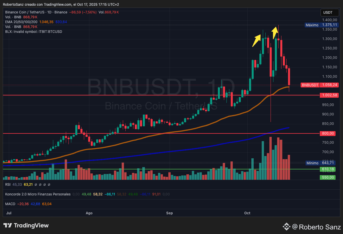 13 de octubre: la presión compradora continuó y BNB marcó un máximo histórico superior a 1.375 dólares. Fue el punto más alto de ese tramo del ciclo y confirmó que el movimiento del día 7 no había sido un mero pico aislado.