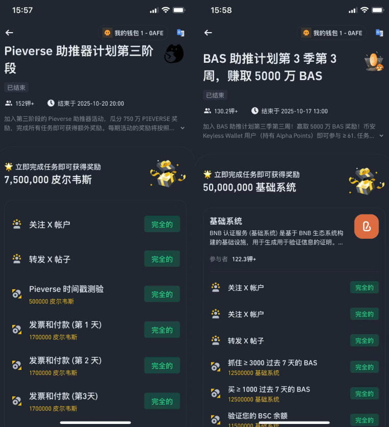 Booster活动是币安钱包的一系列任务,通过完成项目方指定的一些简单操作,即可获得项目方空投的代币奖励。简单来讲就是给项目方“撑人气、活跃度”以获得收益。