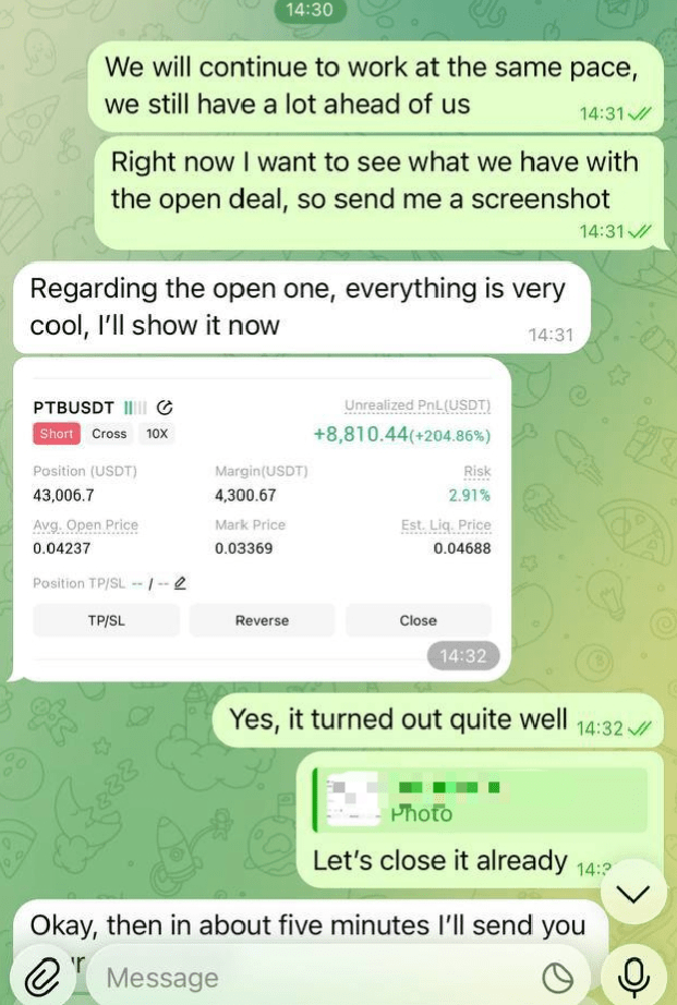 Este ejemplo también destaca la importancia del tiempo. Observa cómo el mensaje dice: “En unos cinco minutos te enviaré.” Eso no es vacilación — es cálculo. Cada trader entiende que cronometrar el mercado con precisión puede ser la diferencia entre asegurar una ganancia del 200% o ver cómo se reduce a un 50%. La paciencia es poderosa, pero la precisión es crítica. Saber cuándo cerrar es tan vital como saber cuándo abrir.