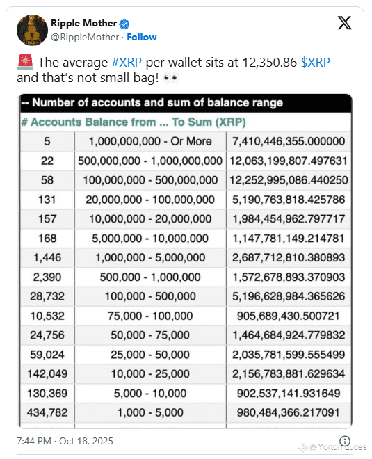 $XRP Una actualización reciente sobre la distribución de billeteras de XRP destacó un saldo promedio de 12,350.86 XRP por cuenta. A primera vista, esta cifra puede sugerir que los titulares típicos mantienen posiciones sustanciales.
