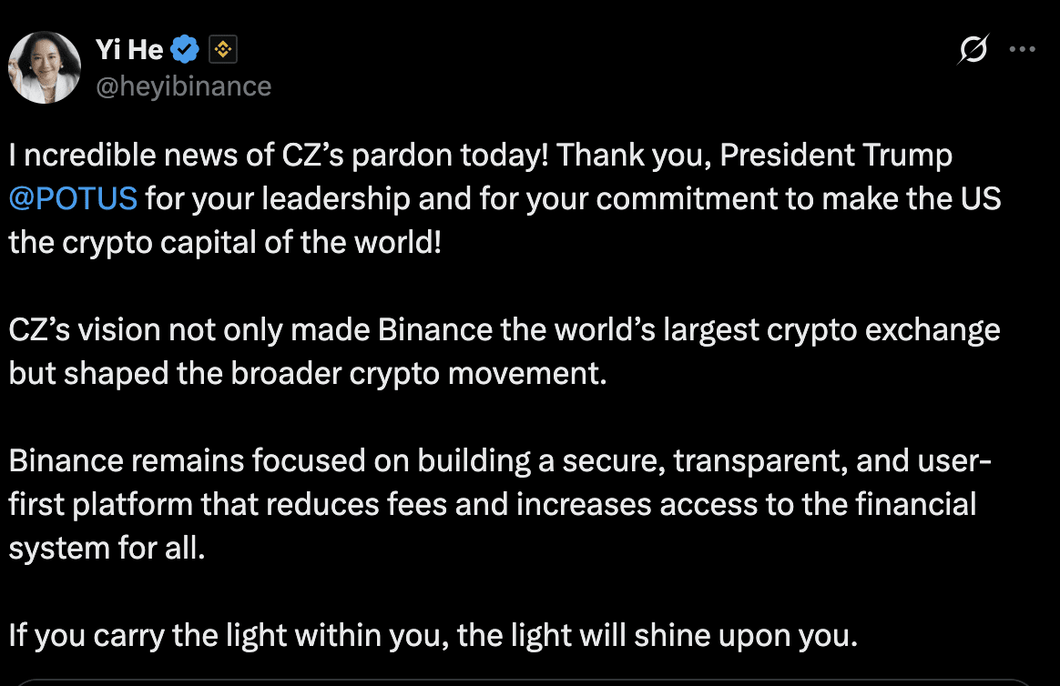 El cofundador de Binance, Yi He, compartió en X que la noticia del indulto de CZ fue realmente alentadora.「Increíble noticia del indulto de CZ hoy. Gracias, Presidente Trump, por su liderazgo y su compromiso de hacer de EE. UU. la capital mundial de la criptografía. La visión de CZ no solo hizo de Binance el intercambio de criptomonedas más grande del mundo, sino que también dio forma al movimiento cripto más amplio. Binance sigue centrado en construir una plataforma segura, transparente y centrada en el usuario que reduzca tarifas y aumente el acceso al sistema financiero para todos.」