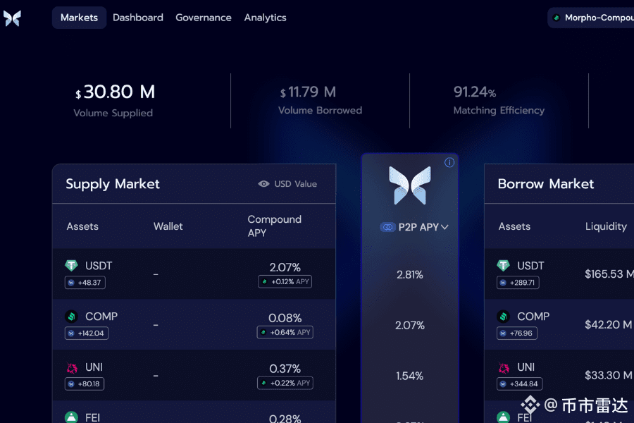 项目概述:Morpho 的核心定位是一个去中心化的借贷池优化器。它并非直接与Aave、Compound等借贷协议竞争,而是构建在它们之上的一个点对点优化层。