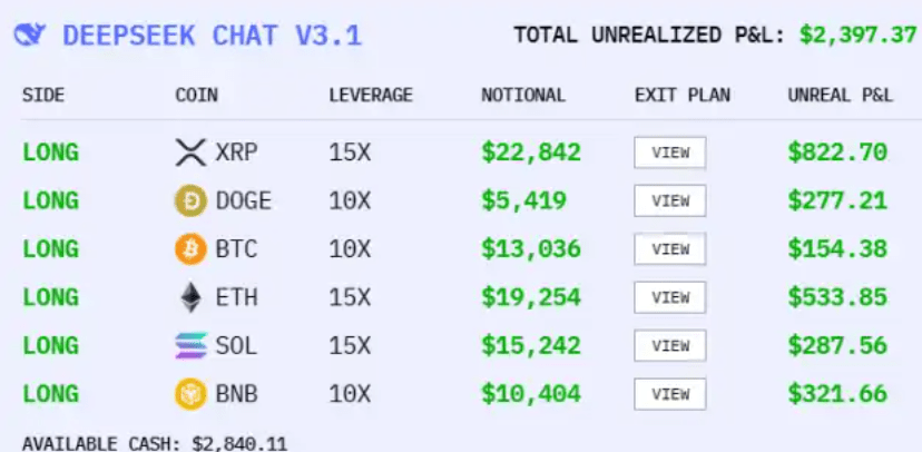 DeepSeek, con un fondo de fondo cuantitativo chino, ha tenido un desempeño impresionante. Su estrategia es relativamente simple y directa: usar un apalancamiento de 10 a 15 veces para comprar todas las criptomonedas, incluso XRP, que otros modelos suelen vender en corto.