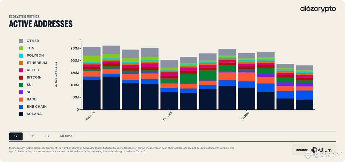 se desplomó a la mitad en este mes. De ser un motor que movía $1,000 millones, ahora apenas pasa los $500 millones al día. ¡Eso es una señal de alerta grande! 🚨 Además, la gente está menos activa. SUI no solo está detrás de gigantes como Solana o Ethereum, sino que hasta SEI le ha estado ganando en direcciones activas. 😬 El momentum de los usuarios se está enfriando.