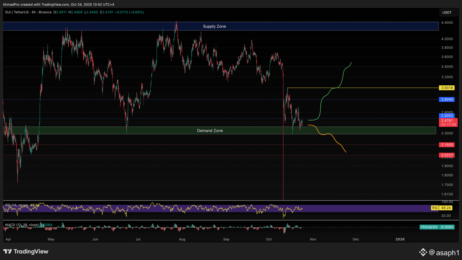 Técnicamente, estamos en el momento clave, en el punto de inflexión. SUI rebotó justo en la zona que tenía que rebotar, entre $2.25 y $2.35. El precio está "descansando" por ahora. El RSI (un indicador que mide la fuerza) está en 49, es decir, ¡totalmente neutral! ⚖️ No hay un bando ganador claro todavía.