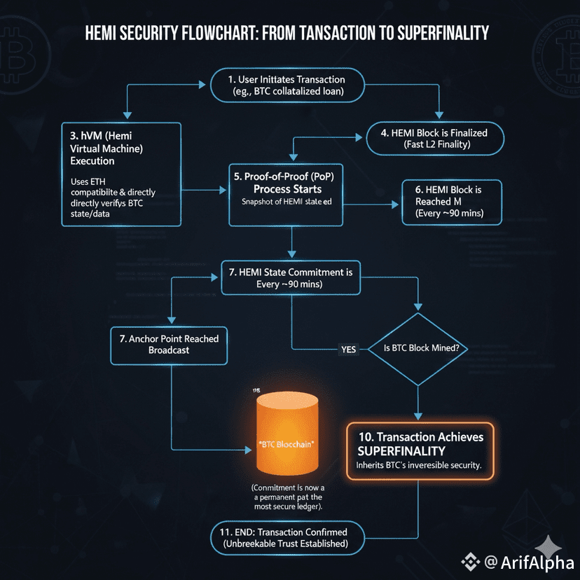 The Security Boost: This is called Superfinality. Once a transaction is "committed" via PoP onto the Bitcoin chain, it inherits the $100 billion-plus hash power and irreversible ledger of Bitcoin itself. Any attempt to reorganize or tamper with the HEMI chain would require a double-spend attack on Bitcoin—a near-impossible feat. This level of finality is essentially "better than Bitcoin" because it leverages BTC's security for faster settlement.