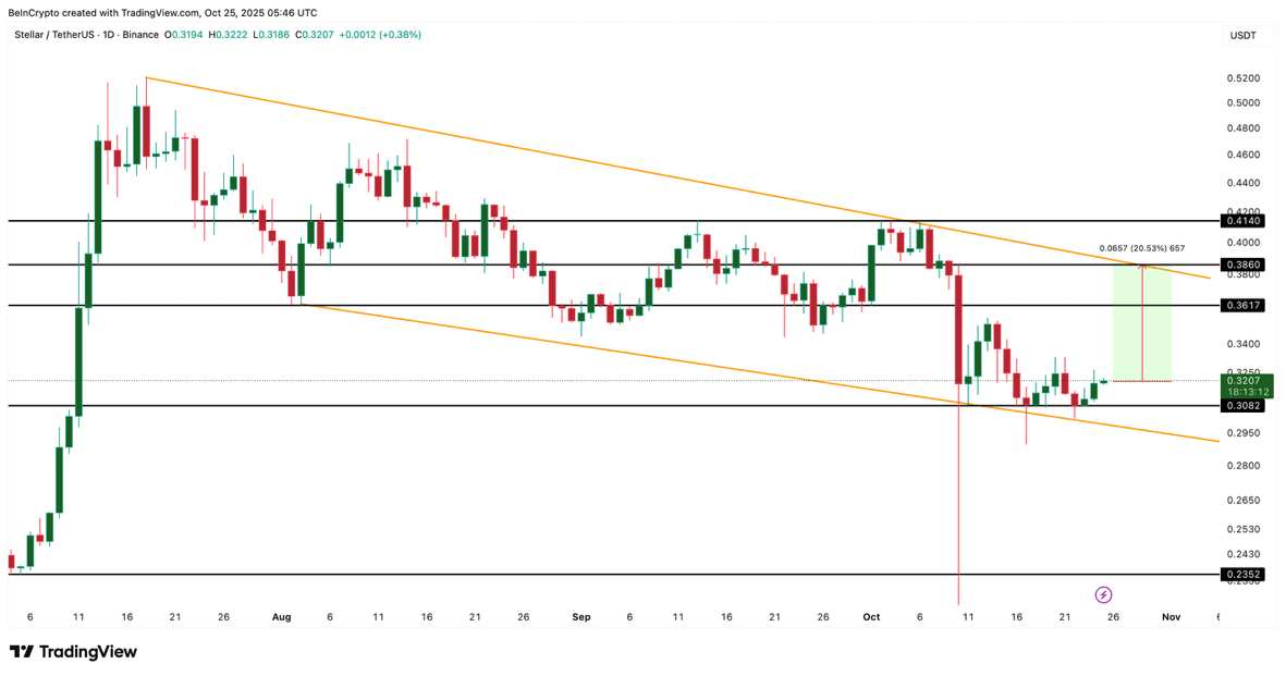 XLM se negocia dentro de un canal bajista, considerando $0.38 como un punto de ruptura que podría cambiar el sentimiento del mercado de bajista a neutral.