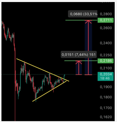 Niveles de Soporte: Si las cosas se ponen difíciles, el soporte inmediato se encuentra cerca de $0.19, que coincide con el límite inferior del triángulo. Una caída por debajo de ese nivel invalidaría la configuración alcista.