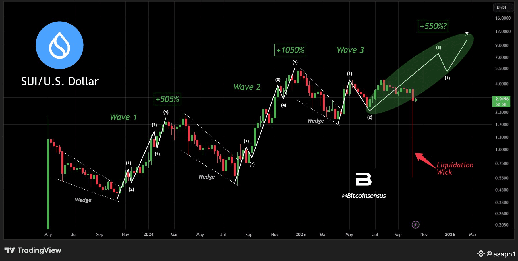 Wave 3 (+550%?): Aquí es donde estamos parados. El gráfico proyecta que la tercera onda, la más ambiciosa, podría llevarnos a un crecimiento de +550% desde el inicio de esta fase. Si esa proyección se cumple, SUI estaría rondando o superando la barrera de los $10 USD para inicios de 2026. ¡Ojo ahí! 👀 El precio actual de $2.91 está justo en el inicio del camino, dentro de ese canal de ascenso dibujado.