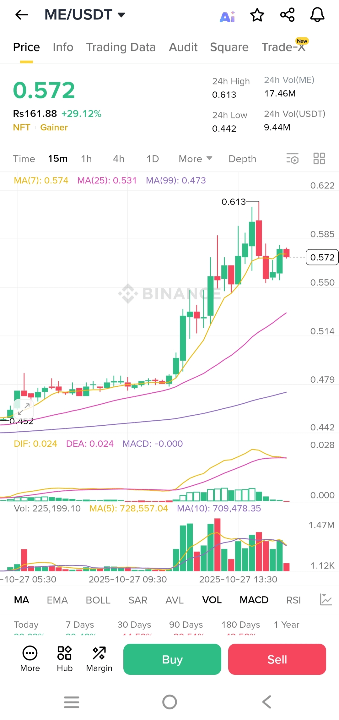 ME acaba de imprimir un movimiento limpio de +29%, negociando alrededor de 0.572 después de alcanzar un máximo diario cerca de 0.613. Lo que destaca no es el pico en sí, sino lo bien que se mantienen esas ganancias. No hay ventas por pánico ni agotamiento, solo velas constantes que siguen probando la zona superior con confianza.