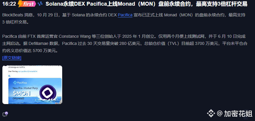 币圈的朋友们,当 Solana 系 DEX Pacifica 突然官宣上线 Monad(MON)永续合约,还带着 3 倍杠杆交易,你是不是以为这只是小众赛道的 “自嗨”?错!这波操作背后,BTC、ETH 的走势逻辑正在悄悄 “换道”,看懂的人已经在偷摸布局,踩坑的人还在为短期波动焦虑到失眠……