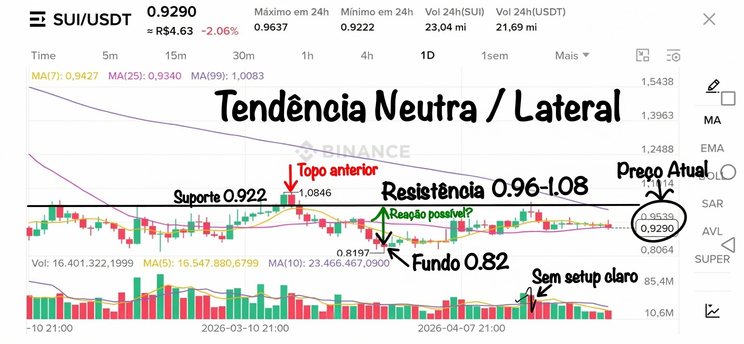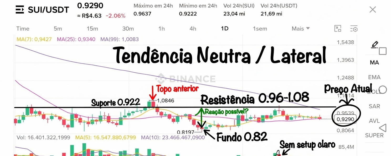 En el gráfico de 1D del SUI/USDT, el precio está en 0,9290 (-2,06% en 24h), oscilando entre un mínimo de 0,9222 y un máximo de 0,9637.