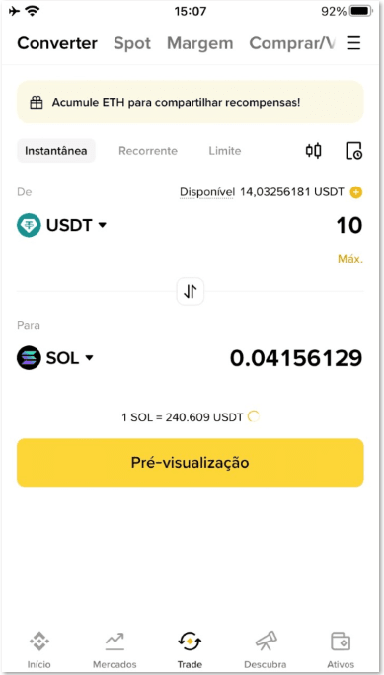 Será dirigido a la área de conversión. Aquí, seleccione la criptomoneda que desea intercambiar (en este caso, USDT) y la altcoin que desea adquirir (SOL). Ingresamos el valor de 10 USDT, y la plataforma mostró la cotización actual, equivalente a aproximadamente 0,04156 SOL.