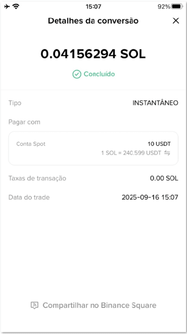 En este ejemplo, usamos el Binance Converter para intercambiar 10 USDT (Tether) por Solana (SOL). El proceso se completó en segundos y sin ninguna tarifa de transacción. ¡Vamos a las pantallas!