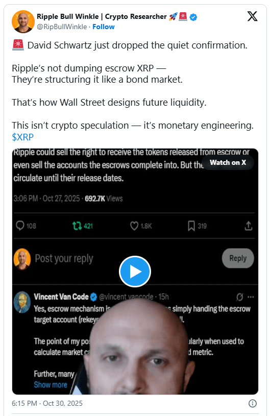 Ripple Bull Winkle explicó esta transformación de manera sucinta, diciendo: “Eso no se llama descarga. Se llama liquidez ingenierizada.” Sus comentarios sugieren que el depósito en garantía de Ripple podría ayudar a crear liquidez estructurada sin inundar el mercado con suministro inmediato.