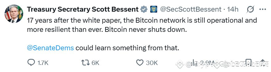 بیسنٹ نے 31 اکتوبر کو X (سابقہ Twitter) پر پوسٹ کرتے ہوئے Bitcoin کے “ہمیشہ آن” نیٹ ورک کی تعریف کی اور کہا کہ “قانون ساز اس سے کچھ سیکھ سکتے ہیں۔”