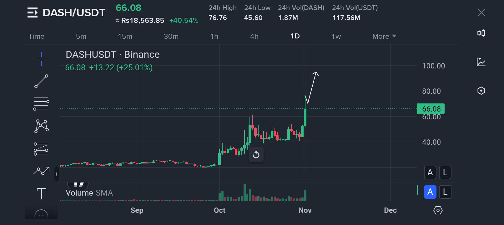 Esta fuerte acción de precios es más que solo un bombeo aleatorio: es una posible reversión de tendencia que podría señalar el inicio de una nueva fase alcista para DASH. La moneda ha superado niveles clave de resistencia, y los próximos objetivos psicológicos están cerca de $80, $90 y $100. Si puede mantener su impulso y volumen de negociación, una carrera hacia la marca de tres dígitos no está fuera de la cuestión. 🚀