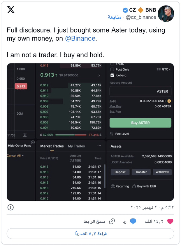 El fundador de Binance, Changpeng Zhao, reveló el 2 de noviembre que compró una cantidad no divulgada del token nativo de Aster utilizando sus fondos personales.