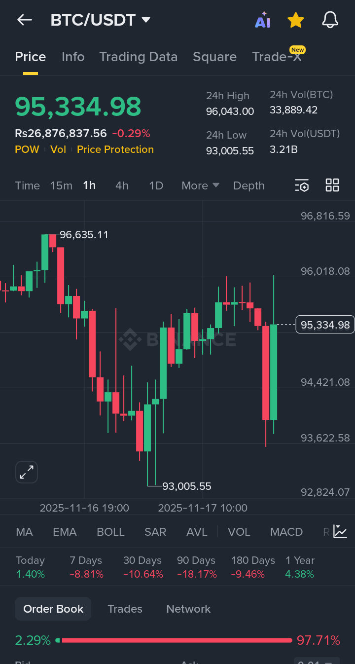 La Historia del Gráfico (1h): ¡Las velas muestran una lucha! Grandes velas rojas (venta) empujando el precio hacia abajo, seguidas de velas verdes (compra) tratando de recuperarse, pero el movimiento general es de mínimos más bajos y máximos más bajos desde el pico de $96,635.11.